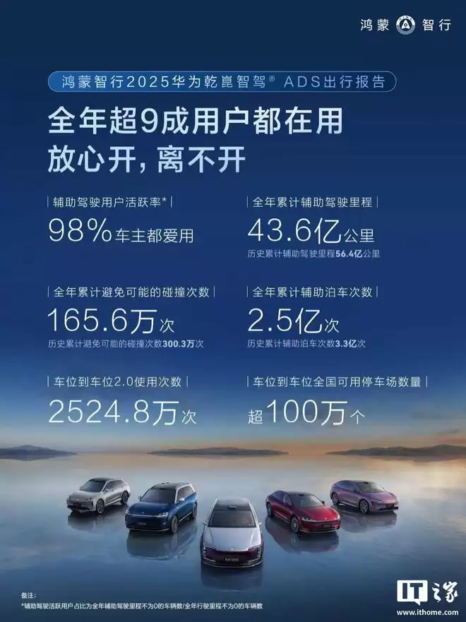IT之家12月31日获悉,鸿蒙智行今日发布了2025年度辅助驾驶成绩单。数据显示,其辅助驾驶功能全年用户活跃度超过九成,累计避免了超过300万次潜在碰撞事故。具体数据如下: