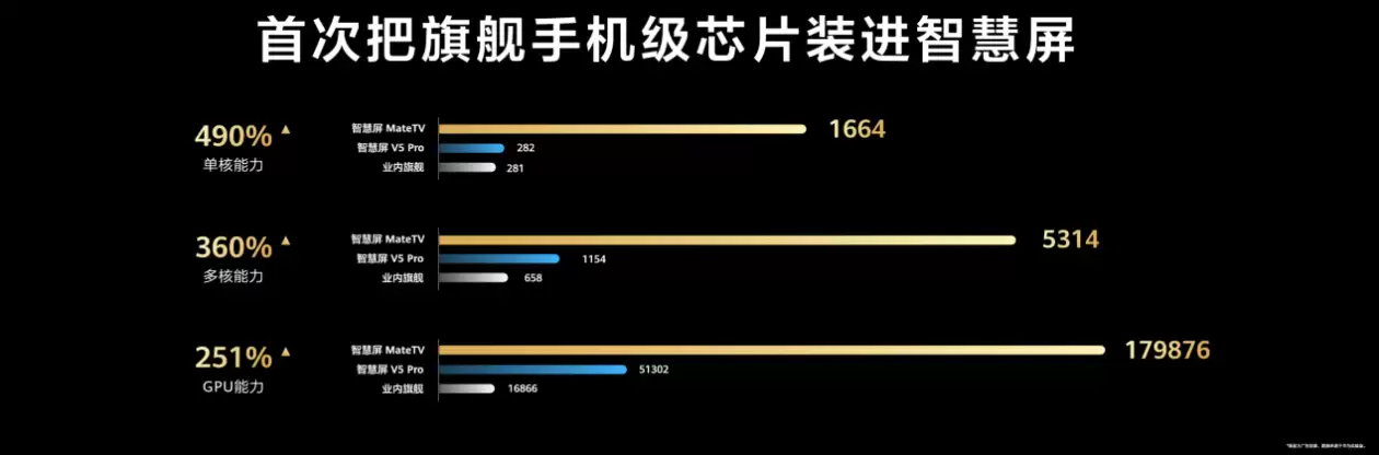 强劲性能和科技创新是Mate系列的基因,华为智慧屏 MateTV延续了这一基因,搭载了旗舰手机级的核心芯片,实现了全方位的性能跃升。相较于上一代,其CPU单核性能提升高达490%,多核性能提升360%;GPU性能提升251%;NPU算力提升约300%。更重要的是,MateTV在电视行业率先采用UFS存储技术,顺序读写速度分别提升约1200%和1500%,彻底告别卡顿历史。