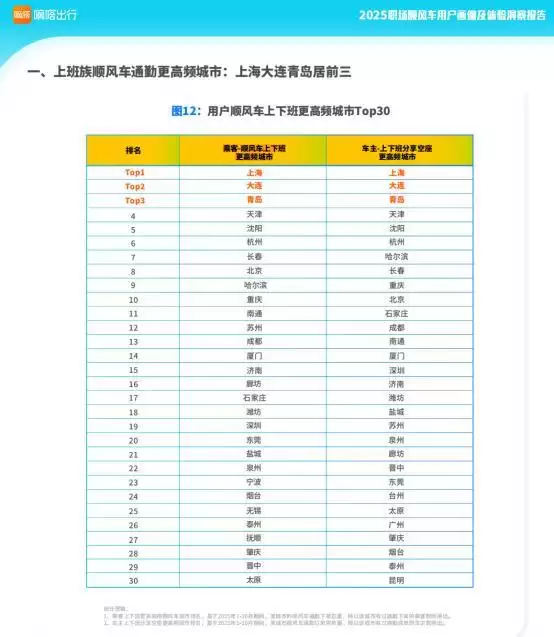 5、在顺风车用户上下班顺风出行高频城市Top30中,前五依次是上海、大连、青岛、天津和沈阳,同时,前十城市北方城市有七座,且四座为东北城市。