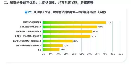 而针对顺风车通勤独特体验,受访用户选择最多的前三项依次是:“都是职场人共同话题更多”占41.4%、“平等互助更容易相互包容关照”占40.5%、“开拓视野,了解更多行业新鲜事”占34.7%。此外,选择“是邻居或上班地点邻近,更有信任感”和“能轻松无负担交流倾诉”的用户分别达32.1%和18.8%。