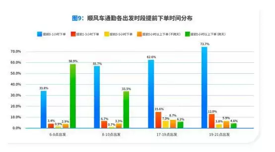 4、提前预约订单在通勤、场站、旅游等各类顺风车场景中占比均较高。在通勤场景中,近45%的顺风车乘客,上下班会提前1小时以上下单。如是早八点前出发,提前一天下单占比达58.9%。