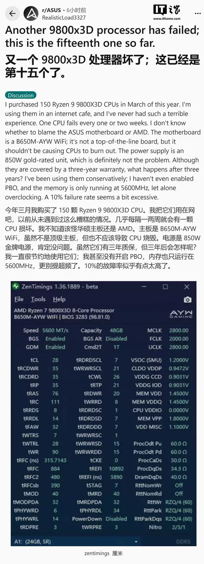 据这位经营者描述,故障发生频率大约为每一到两周就损坏一颗,这种“随机死亡”的现象让其损失惨重。此前,关于Ryzen 9800X3D的报告多集中在华擎主板上,而此次事件表明,即便采用华硕主板也未能幸免。这显示出该故障可能并非特定主板品牌的个案。