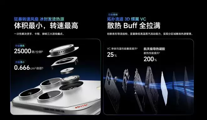 而年末发布的荣耀WIN系列两款新机,不仅延续了小尺寸风扇的设计,还成功将噪音控制在25dB,并且整机的防尘防水规格做到了IP68、IP69、IP69K,与当前非电竞手机拉到了同一个层级。此外,包括这颗风扇本身的使用寿命问题,荣耀最新也提供了长达5年的清灰保养服务。