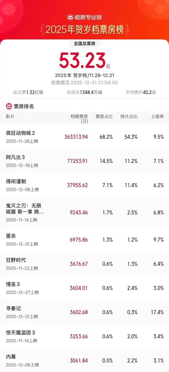 根据猫眼专业版数据显示,截至12月31日21时,2025年贺岁档总票房已突破53.23亿元,位居中国影史贺岁档票房排行榜第二位。其中,《疯狂动物城2》凭借出色表现,成功摘得中国影史贺岁档票房冠军。
