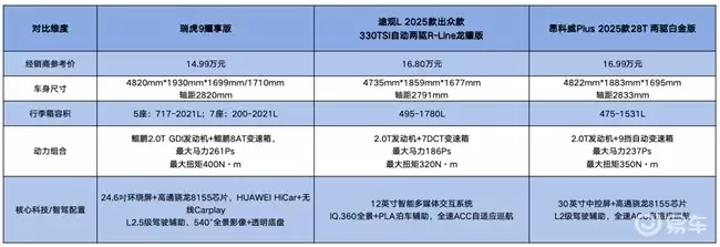15万级SUV燃油车选购指南:瑞虎9、途观L、昂科威Plus配置空间对比