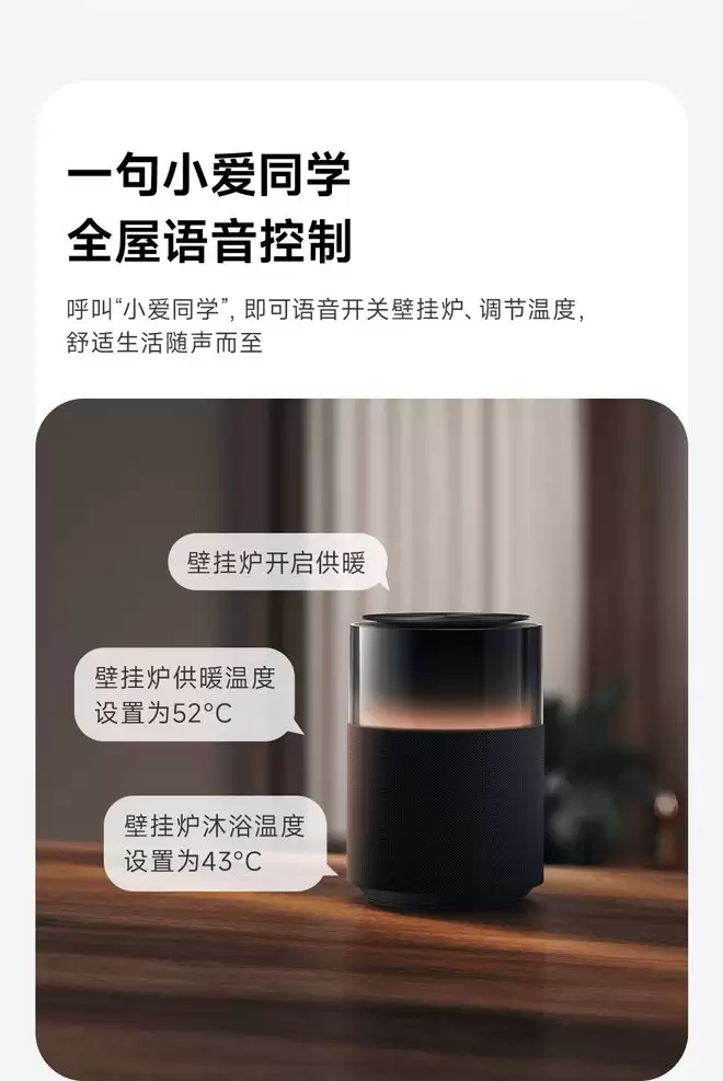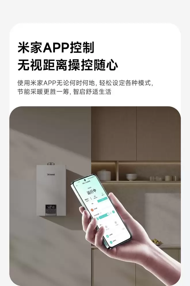 现在,用户可以直接通过米家App来控制这台壁挂炉的各项功能设定。无论是调整采暖温度,还是管理生活热水,都能轻松完成。更便捷的是,你还能直接呼唤小爱同学,用语音指令来开关采暖和热水,体验更智能、更连贯的居家温控管理。