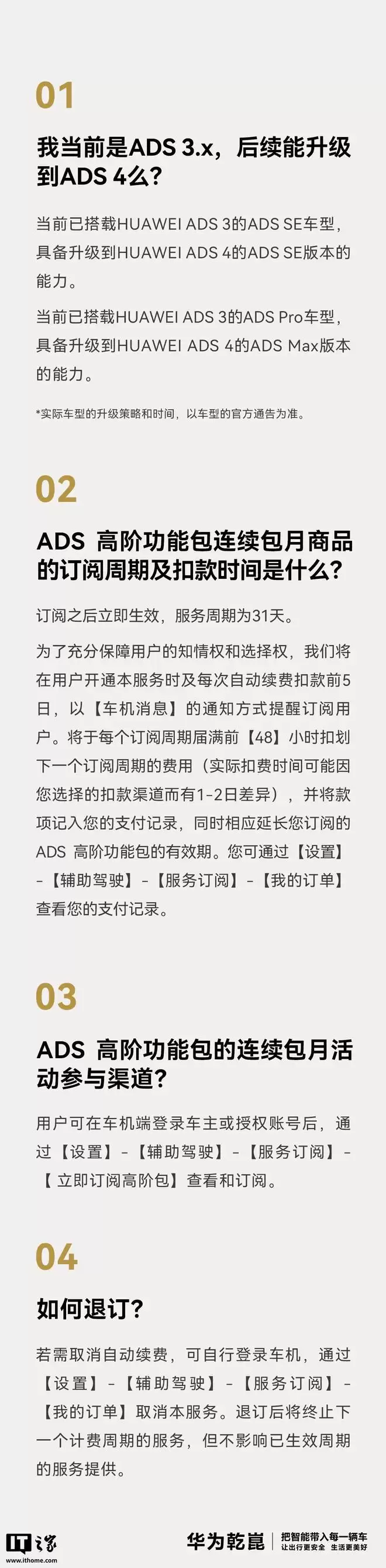 华为方面最新表示,乾崑智驾ADS 4和ADS 3的ADS SE高阶功能包价格维持不变,而乾崑智驾ADS 4的ADS Pro & ADS Ultra高阶功能包的价格将在后续公布。此外,华为还针对用户关心的热点问题进行了解答: