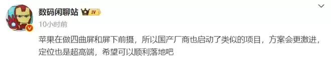其次,相较于苹果的四曲屏项目,国产厂商的跟进更值得玩味,爆料显示国内头部厂商不仅已经启动类似项目,方案还会比苹果更激进。