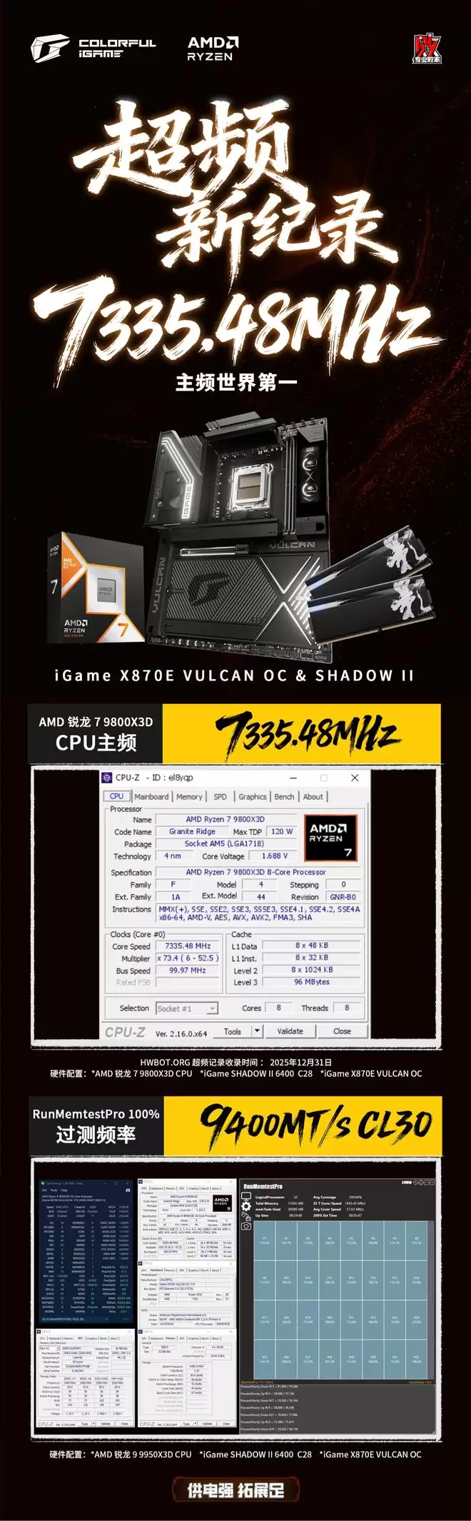 IT之家12月31日讯,七彩虹今日宣布,其旗舰级AMD主板iGame X870E VULCAN OC成功刷新了AMD锐龙7 9800X3D处理器的主频世界纪录。在单线程模式下,以1.688V电压将该处理器超频至惊人的7335.48MHz。