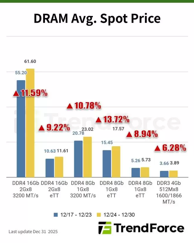 数据显示,主流芯片(DDR4 1Gx8 3200MT/s)的现货均价已从12月24日当周的22.235美元,强势上涨6.80%至12月30日当周的23.746美元。