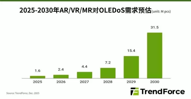 集邦咨询TrendForce的研究数据显示,AR、VR、MR等近眼显示设备对OLEDoS微显示器的需求,预计将在2030年达到约3,150万片。从2025年到2030年,该市场的年复合增长率(CAGR)有望高达81%。集邦咨询进一步预估,OLEDoS技术在全球VR/MR设备中的渗透率,到2030年将大幅提升至接近60%。