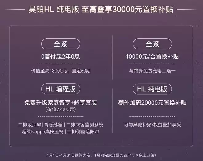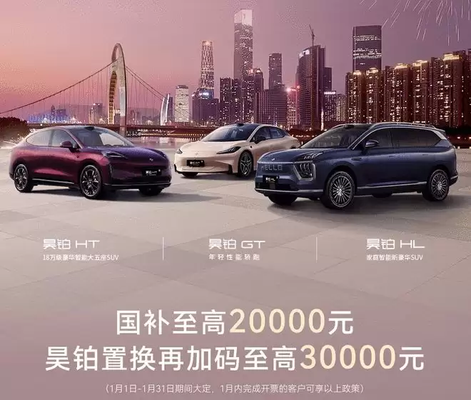 网易汽车1月1日报导,广汽昊铂品牌在2026年初为旗下多款车型推出“政企双补”限时礼遇,最高可享价值50000元的组合权益。其中,“政企双补”礼遇包含最高20000元的国补,以及昊铂品牌额外提供的最高30000元置换补贴。两者叠加后,消费者购车最高可获得50000元优惠。