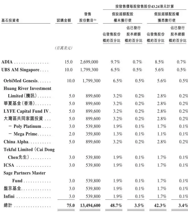 其中,ADIA认购1500万美元,UBS AM Singapore、OrbiMed Genesis分别认购1000万美元,讯旗下Huang River Investment、华夏基金(香港)、LYFE Capital Fund IV、大湾区共同家园投资、China Alpha分别认购500万美元,Tekful Limited (Cai Dong Chen)、ICSA、Sage Partners Master Fund、盘京基金、Infini分别认购300万美元。
