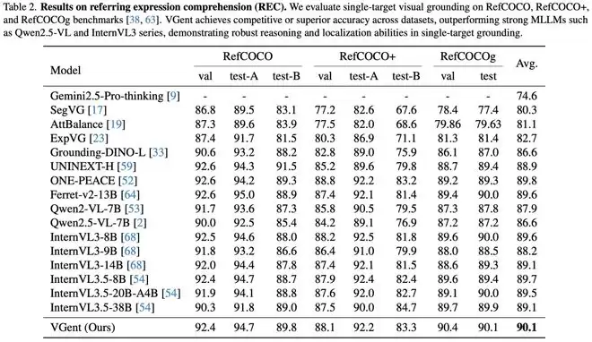 VGent实现了90.1%的平均准确率,超越了InternVL3.5-20B和38B等更大规模的模型 。相比其backbone (Qwen2.5-VL-7B),VGent带来了+3.5%的平均性能提升。