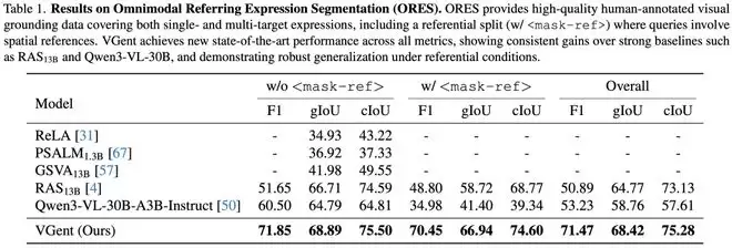 如图六所示,在极具挑战的ORES基准上,VGent 取得了全新的SOTA成绩。相比之前的最佳方法RAS13B,VGent在F1分数上实现了+20.58%的巨大提升。VGent在gIoU和cIoU上都带来了明显的提升。