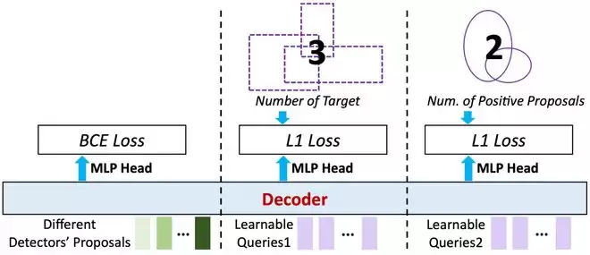 为了提高召回率,研究人员聚合了来自多个detector的proposal形成一个统一的query set,之后引入了额外的 learnable queries与这些proposal queries拼接作为decoder的输入。