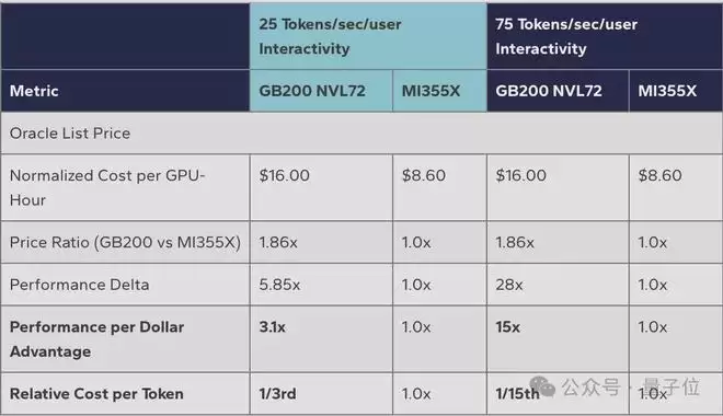 直觉上,性能更强的平台应该更贵。事实也确实如此:根据Oracle Cloud的公开定价,GB200 NVL72的每GPU每小时价格为16美元,MI355X为8.60美元,前者是后者的1.86倍。