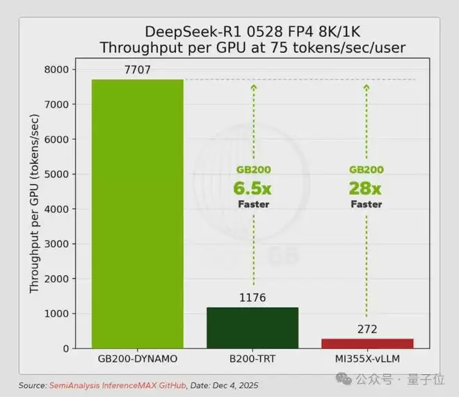 这款OpenAI开源模型拥有1170亿总参数,但每个token只激活约51亿参数。在2025年12月的测试数据中,100 tokens/sec/user交互性下B200的性能接近MI355X的3倍。