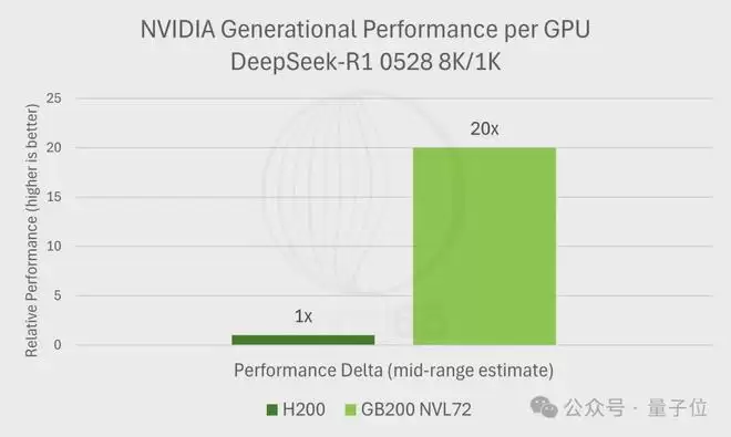 报告估算在DeepSeek-R1的典型工作负载下,GB200 NVL72相比H200的性能提升约20倍。