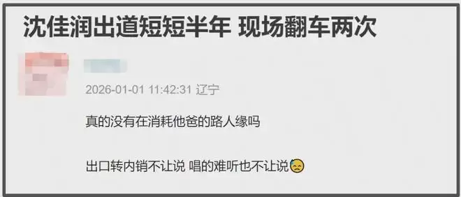 沈佳润在韩国数据不佳,出道半年时间全在内娱活动了,杂志、晚会等刷脸资源一个接一个,只是实力接不住资源,现场两次演唱大翻车,且一次比一次严重,第一次捂嘴还能以“孩子还小,紧张”容忍,第二次就很难了,所以批评声、吐槽声像暴雨一样倾盆而至,其实都是早早埋下的雷。