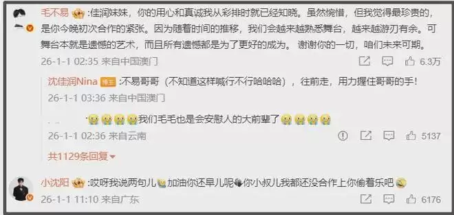 而后,毛不易和小沈阳陆续在评论区留言,毛不易大气表示彩排时就接收到了沈佳润的真诚和用心,让她不要因为遗憾和紧张懊恼,未来舞台会随着时间变得成熟。小沈阳则在评论区用词幽默地帮女儿解围,让女儿加油,一句“你还早儿呢”似乎是说沈佳润年龄还小,未来可期,也与先前谦虚的态度有所不同。