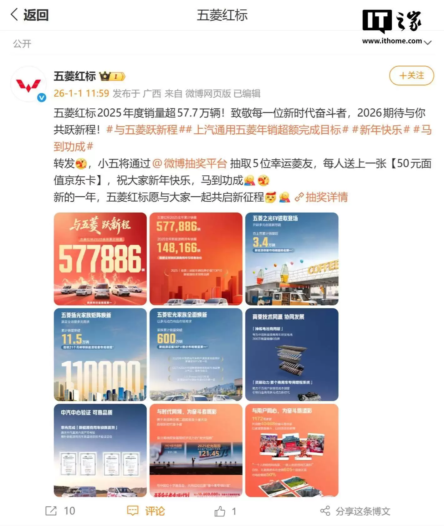 商用车方面,五菱红标系列2025年累计销量达577,886辆,连续多年蝉联全国商用车销量冠军。其中,新能源商用车累计销量为148,166辆,登顶新能源商用车市场销量榜首位,并连续10个月实现同比增长超100%。
