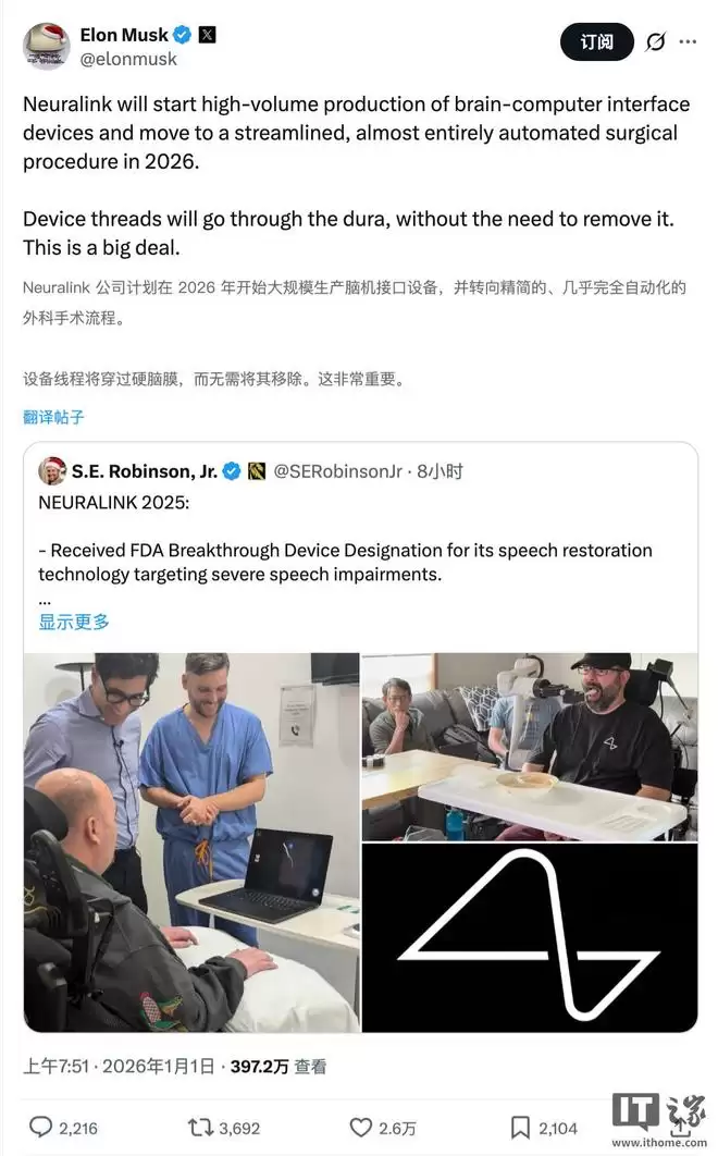 IT之家1月1日消息,北京时间今天上午,美国企业家埃隆·马斯克在社交媒体X上宣布,其脑机接口公司Neuralink将于今年启动“大规模生产”脑机接口设备,并转向更精简、几乎完全自动化的外科手术流程。马斯克表示,该设备的电极丝将直接穿过硬脑膜,而无需将其切除,此举意义重大。