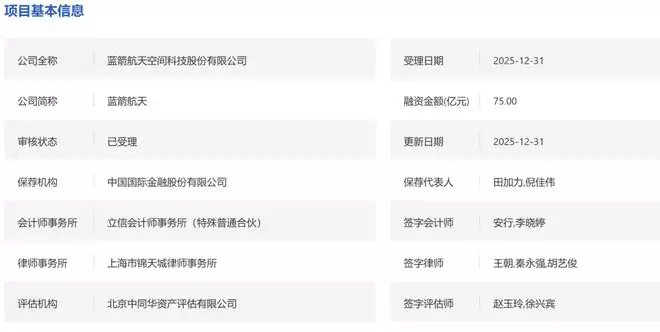 2025年12月31日,据上交所正式显示,蓝箭航天空间科技股份有限公司(以下简称“蓝箭航天”)科创板IPO审核状态变更为“已受理”,保荐机构为中金公司,拟募资75亿元。此时距蓝箭航天7月29日获得辅导备案受理耗时155天。