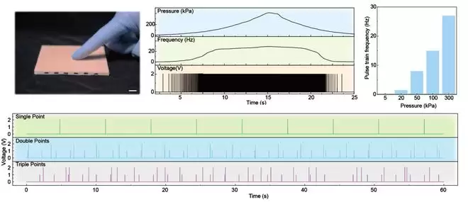 NRE-skin 的核心灵感来自于人类自身的皮肤和神经系统。它不再只是被动地传送信号,而是模仿了人类神经末梢主动产生脉冲信号的方式。皮肤上每一个微型压力传感器都连接一个脉冲发生器,当受到按压的时候,就会产生一连串电脉冲,按得越重、脉冲频率就越高。