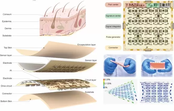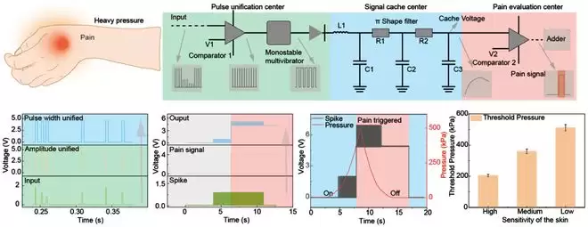 在 NRE-skin 中,于欣格团队设计了一个疼痛中心。当外部对皮肤施加过大的机械刺激时,皮肤的类神经架构会将刺激转化为脉冲并且持续积累,当累积超越设定阈值,即相当于人类感知疼的界限,痛觉信号就会被触发,NRE-skin 会发出一个强烈的疼痛信号。
