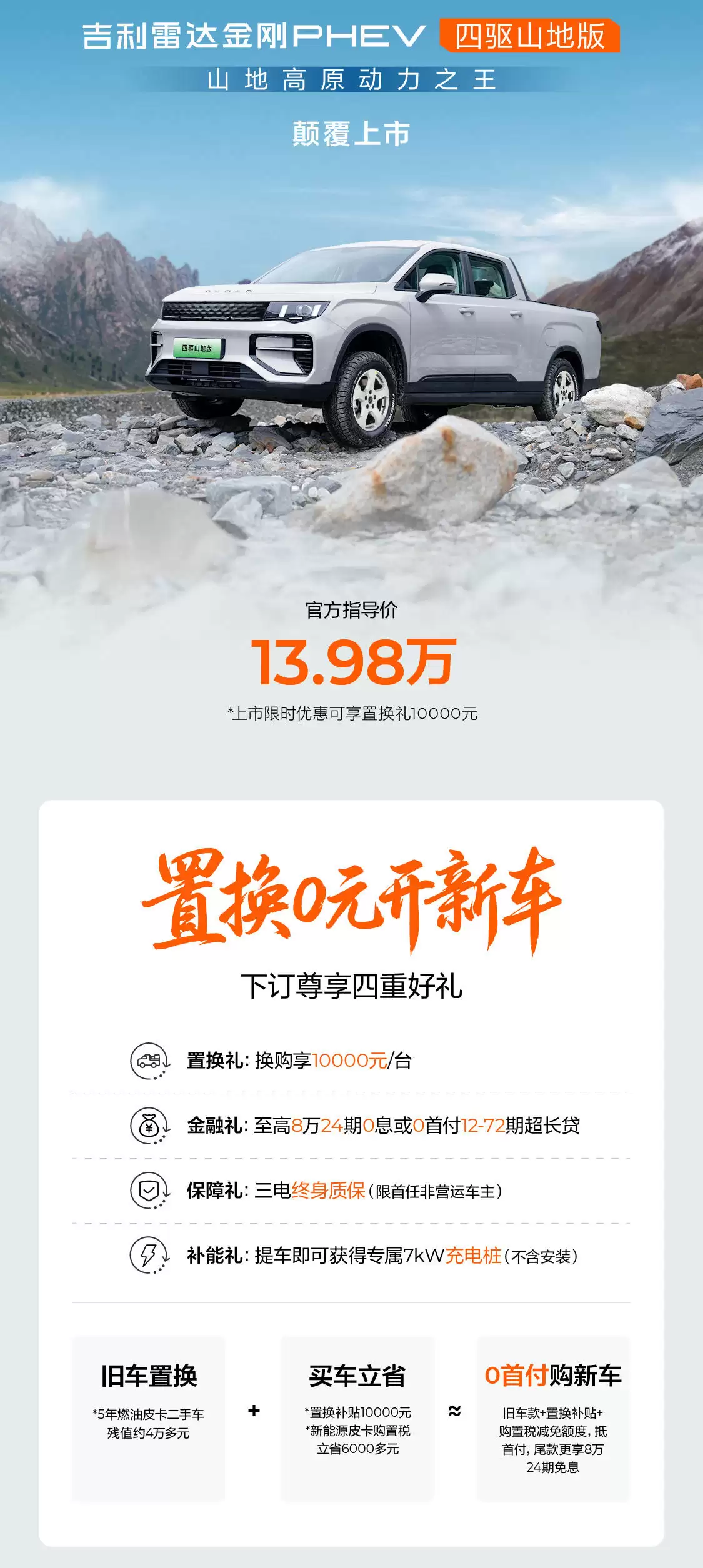 吉利汽车正式上市了两款全新皮卡车型——雷达金甲PHEV山地版与雷达地平线PHEV高寒版,这两款兄弟车型面向不同区域:前者专为西南、西北等高原山区的复杂路况设计,后者则为适应东北、西北严寒地带而生。其中,山地版最新指导价为13.98万元起,高寒版定价15.18万元起。两台车均搭载了与领克同款的雷神EM-P超级电混系统,以其强悍动力与实用多功能性为核心卖点。
