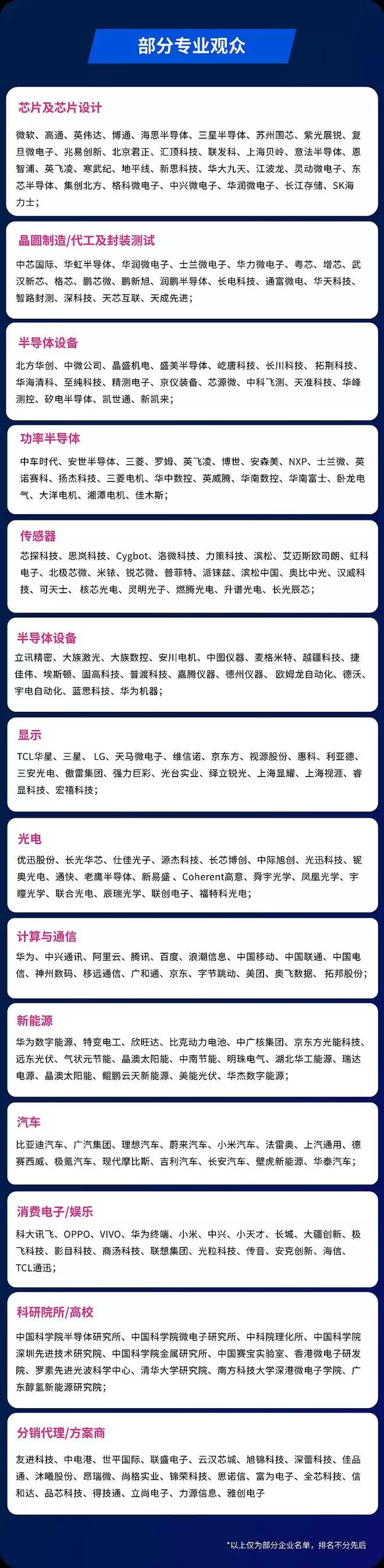 展会精准锚定芯片设计与制造领域核心需求,打造全维度、高匹配度的专业观众矩阵。参展企业可高效对接 IDM、Fabless、Foundry、OSAT 等半导体产业链上下游核心企业,直面人工智能、消费电子、汽车、通信及计算、显示、光电、新能源等领域的系统厂商、分销代理商、解决方案商,以及终端采购与研发决策层。展会以“芯片设计 - 制造 - 封测”产业链与“终端应用”市场的双向贯通为核心链路,助力参展企业一站式链接下游关键市场,实现精准商贸对接与合作转化。