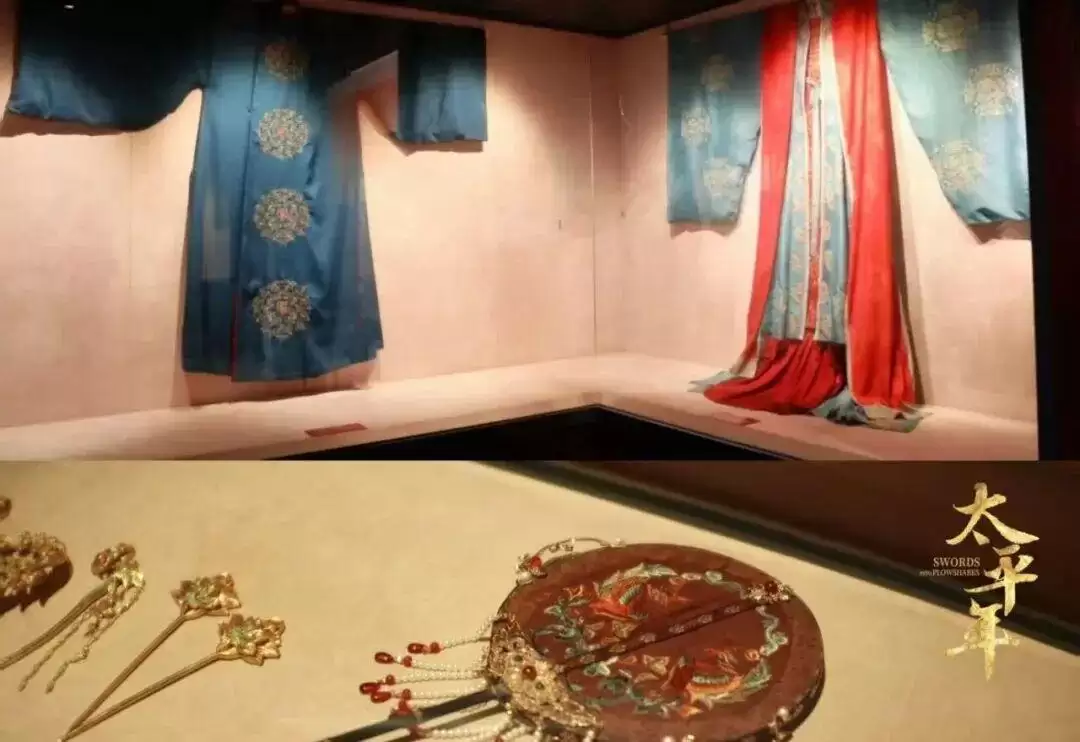 两间独立的精品陈列室,集中呈现了剧中华美考究的服饰与道具。展柜之中,既有采用传统“草木染”工艺复原的帝王冕服、大婚吉服,也刻有吴越纹样的熏炉、茶筅等器物。