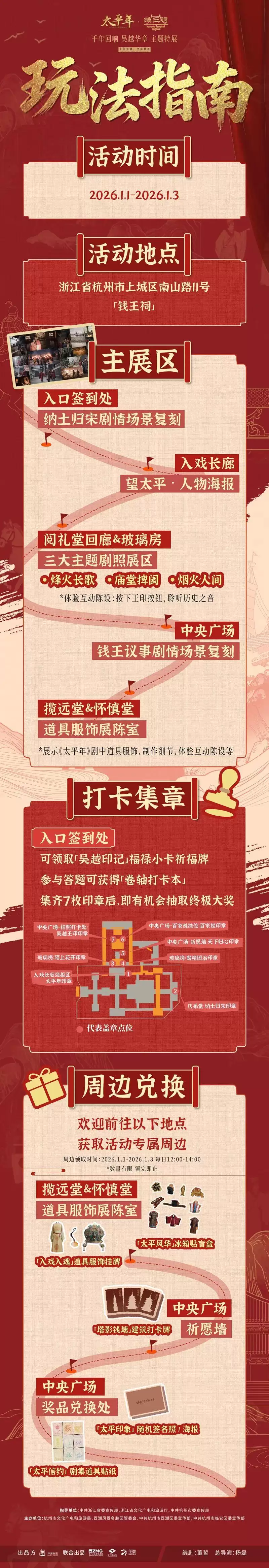 展览在1月1日至3日每日12:00-14:00设置专属互动时段,推出打卡集章、限量周边兑换等活动。游客可在入口处化身历史探秘者,参与答题互动领取限定版《太平年》卷轴,前往七大展区集章打卡获取冰箱贴、服饰香卡、随机签名照等专属剧集周边。钱王祠的中央广场还设置了拍照装置,游客在此打卡可获得人物剧集海报同款,收获“太平年·钱王祠”专属特别报道。