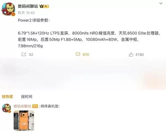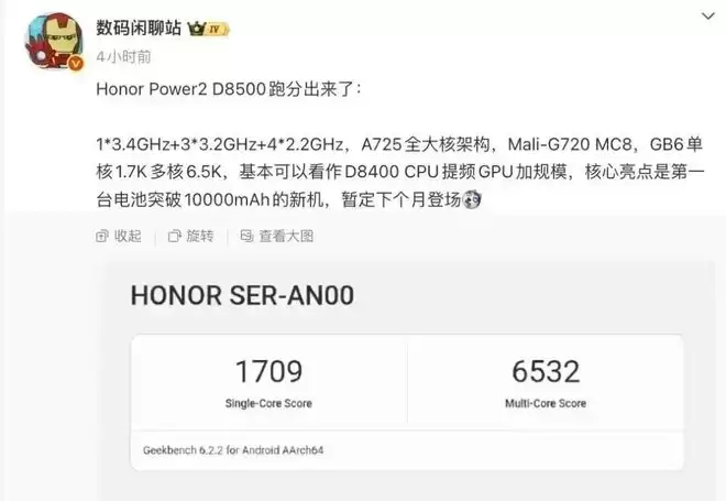 最新信息显示,荣耀Power2行业首发天玑8500 Elite芯片,安兔兔综合跑分240W+,档位第一。