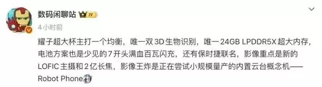 除此之外,博主@数码闲聊站 的另一份爆料显示,“耀子超大杯主打一个均衡,唯一双3D生物识别,唯一24GB LPDDR5X超大内存,电池方案也是少见的7开头满血百瓦闪充,还有保时捷联名,影像重点是新的LOFIC主摄和2亿长焦,影像王炸是正在尝试小规模量产的内置云台概念机——Robot Phone”。