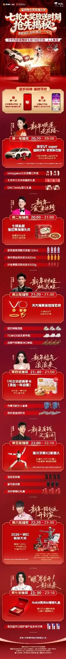 活动期间,消费者只需打开京东APP参与“跨晚”互动,即有机会赢取装载京东鲜花的埃安UT super国民好车、七鲜私厨宿迁黄狗猪头肉、智元灵犀X2机器人、承包全年可生食鸡蛋的1号会员店尊享卡、周大福黄金婚嫁套装等豪华大奖,更有覆盖2026元京东超市卡、9999元京东健康卡、奥佳华Ten+4.0按摩椅、TCL98Q10L电视、京喜2026件鸿运套装、斯波兹曼新国标电动车、智元远征A2机器人在内的“2026一路红”超级大奖,让你把好运“打包”带回家。