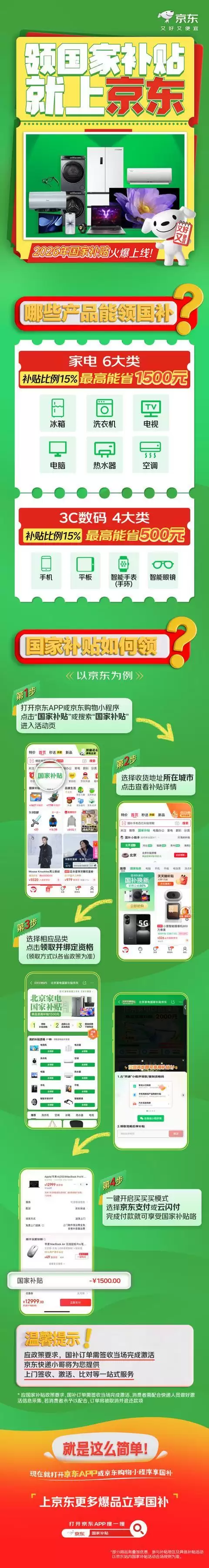 以京东为例,在国补使用方式上,消费者只需简单三步,就能轻松获得2026年国补优惠。第一步,打开京东APP,搜索“国家补贴”,即可直达国补主会场;第二步,点击进入对应省市页面,根据提示领取国补资格;第三步,消费者既可以在会场内浏览选购,也可以直接搜索带有国补标识的商品下单,结算时即可自动完成补贴减免!