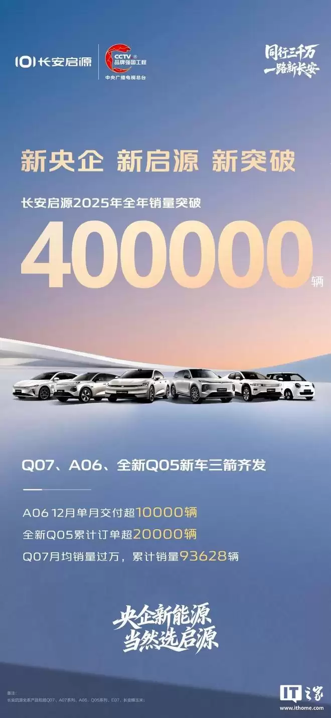 IT之家1月1日消息,长安启源今日正式宣布,其在2025年全年的销量成功突破40万辆大关: