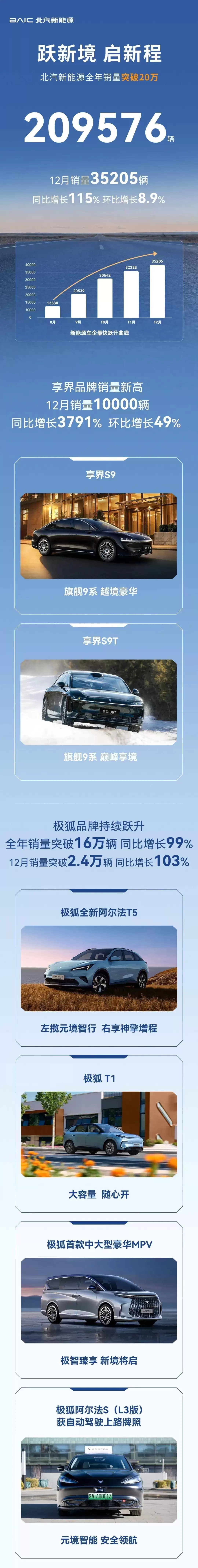 北汽集团旗下新能源企业北汽新能源(亦称“北汽蓝谷”)近日公布了2025年销售业绩,全年累计销量突破20万辆大关,达到209576辆,较上一年度劲增84%。尤为亮眼的是,12月单月销量表现出色,以35205辆的成绩实现了115%的同比增长,连续三个月保持月销超3万辆的强劲势头。