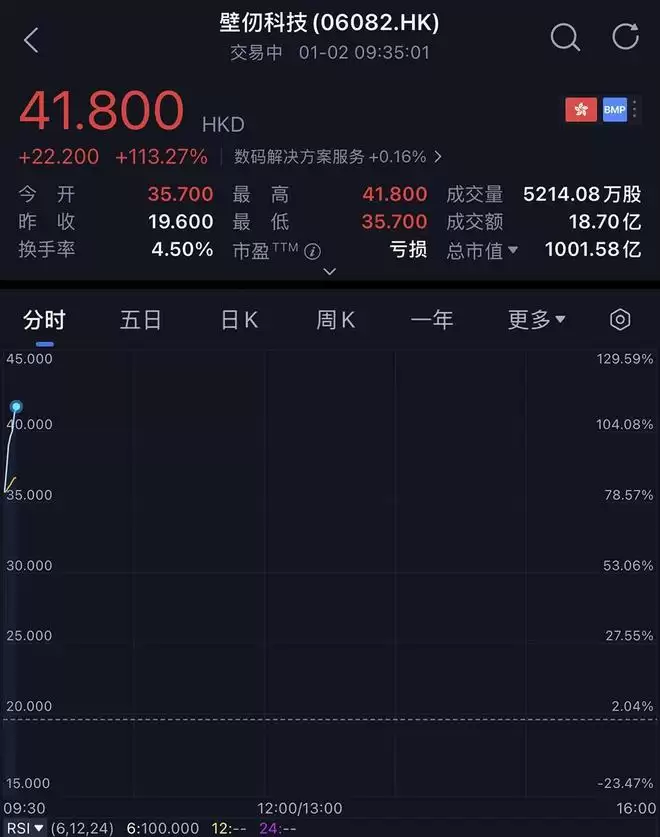 截至9点35分,壁仞科技股价为每股41.80港元(约合人民币37.52元),最新市值为1002亿港元(约合人民币899亿元)。