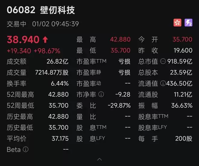 1月2日,被誉为“港股GPU第一股”的壁仞科技(06082.HK)在港交所成功上市。该股以35.7港元/股的价格开盘,较19.6港元/股的发行价大幅上涨82.14%。截至发稿时,壁仞科技股价涨幅一度超过118%,触及42.88港元/股,公司市值突破900亿港元。