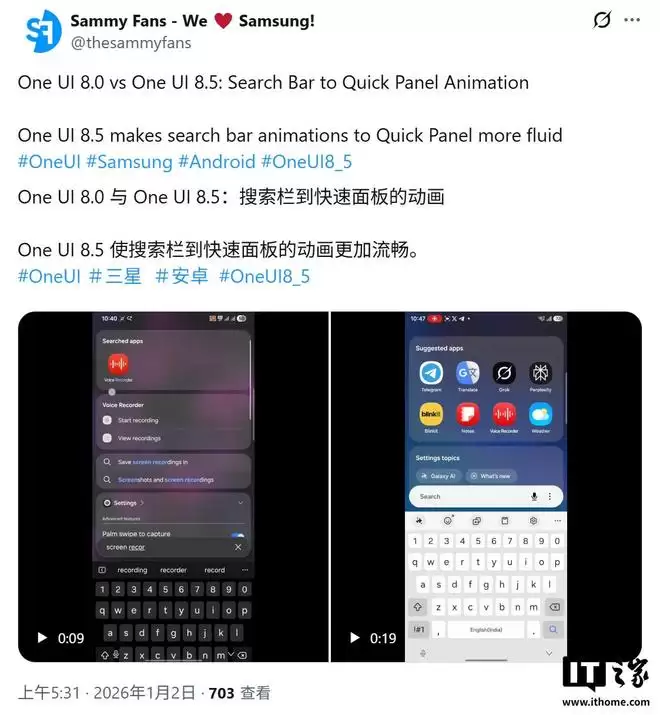 IT之家 1月2日消息,科技媒体SamMyFans昨日(1月1日)发布博文称,三星在One UI 8.5系统中重点优化了视觉流畅度。新版系统在执行从搜索栏到快捷面板(Quick Panel)的动画时,图标与结果呈现出更自然的淡入效果,消除了视觉上的突兀感。