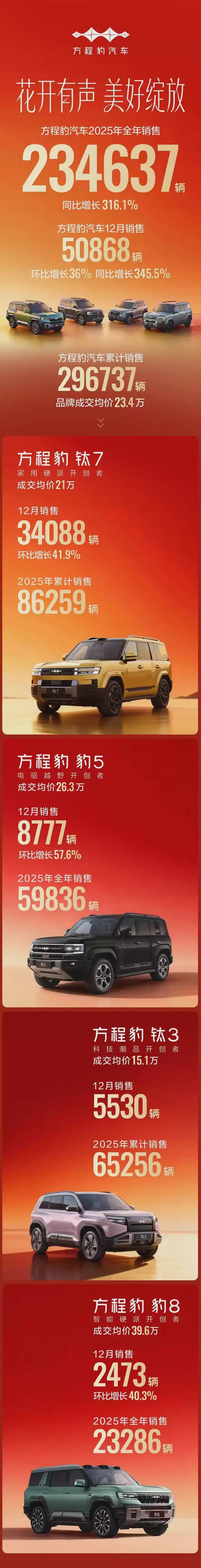 网易汽车1月2日讯 近日,比亚迪方程豹汽车发布了2025年度销售报告:其全年累计销量达到234,637辆,同比增长幅度高达316.1%;其中,2025年12月单月销量为50,868辆,环比增长36%,同比增幅更是达到了345.5%。