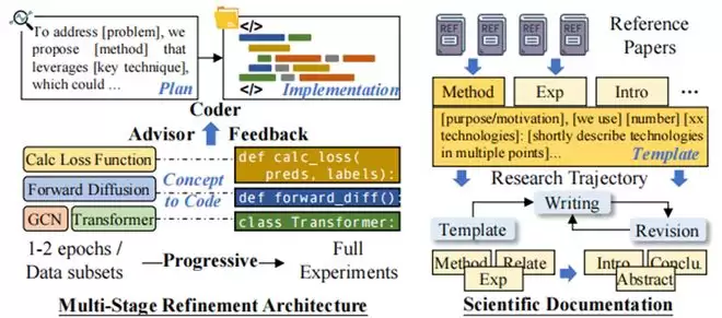 代码智能体负责根据计划进行初始实现,顾问智能体则像导师一样审核代码的正确性,并通过分析初步实验结果提供修改建议。两者形成多轮的实现-反馈-优化循环,显著提高了复杂算法的实现成功率。