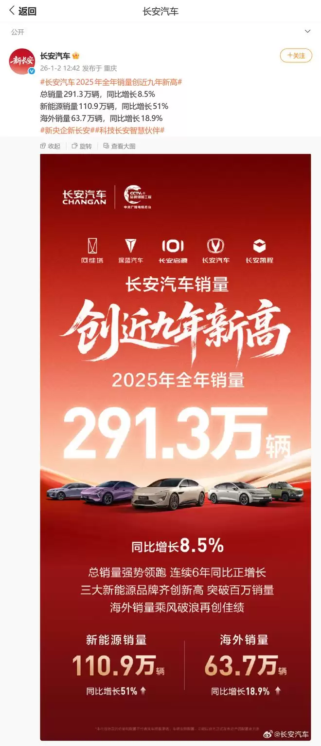 2025长安汽车全年销量291.3万辆,同比增长8.5%创新高