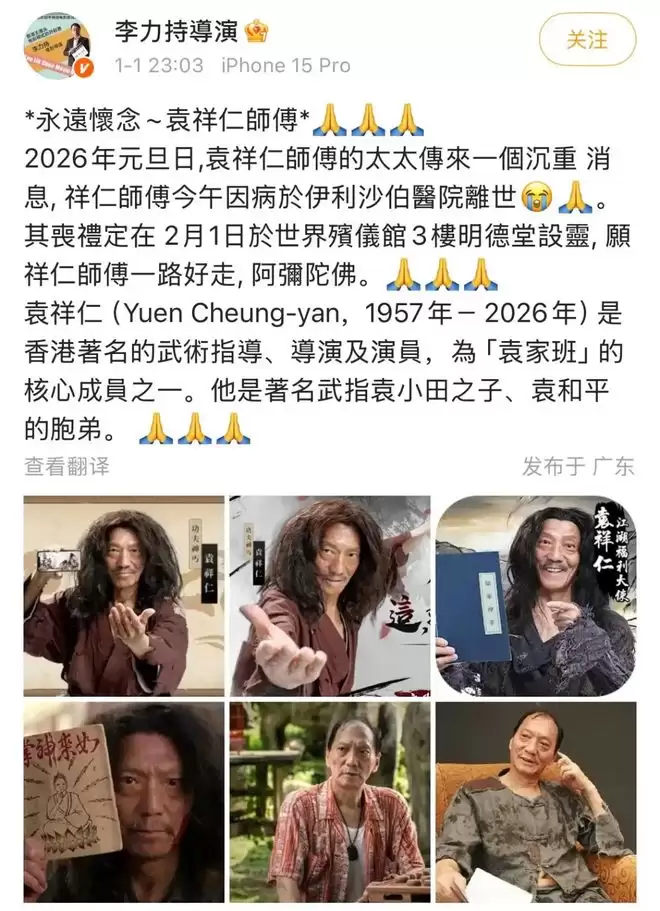 2026年1月1日,香港导演李力持在微博发布的一则讣告,让华语影视圈陷入悲痛之中。讣告显示,香港著名演员、金牌武术指导袁祥仁于当日因病在伊利沙伯医院离世,享年69岁。据悉,袁祥仁的丧礼已定于2月1日在世界殡仪馆3楼明德堂设灵,这一消息不仅让无数影迷扼腕叹息,也为新年的影视圈蒙上了一层伤感的面纱。作为“袁家班”的核心成员、武术宗师袁小田之子、国际知名武术指导袁和平的胞弟,袁祥仁用数十年的深耕,在华语武侠影视史上留下了浓墨重彩的印记,他的离世,无疑是武侠影坛的重大损失。