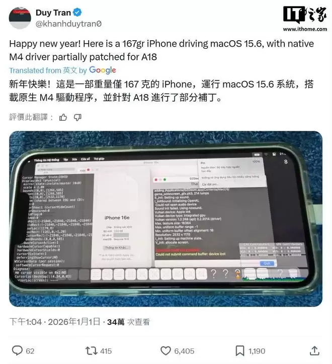 Duy Tran 解释称,他移植的系统搭载了 M4 桌面端芯片的原生驱动程序,并针对 A18 移动端芯片打上了部分补丁。