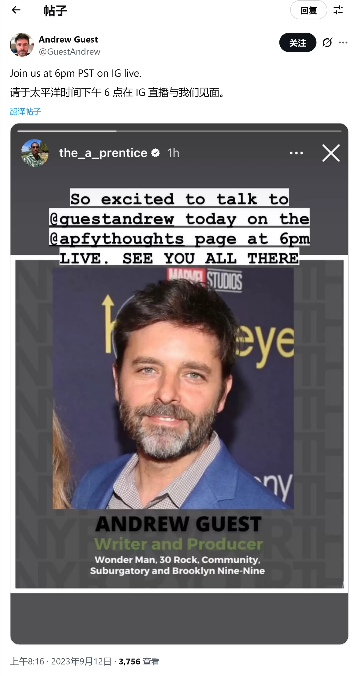 安德鲁·盖斯特出任剧集主管,图源:他的 X 账号