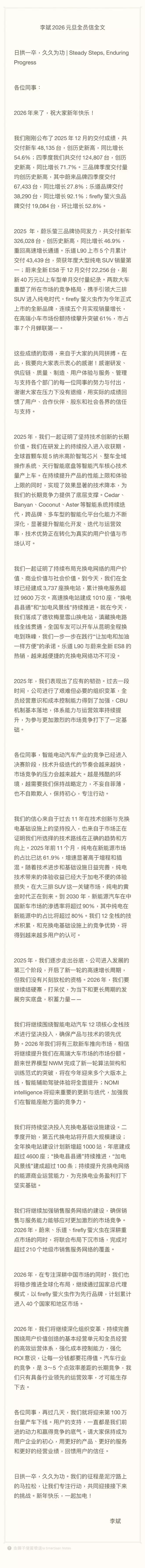 据电动知家消息,蔚来汽车董事长李斌在公司2026年元旦致全体员工的信中,系统总结了公司在2025年取得的卓越成绩,并明确了新一年的发展方向。